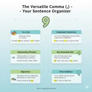The comma is probably the most used (and sometimes misused!) punctuation mark. It signals a short pause in a sentence and helps organize information.