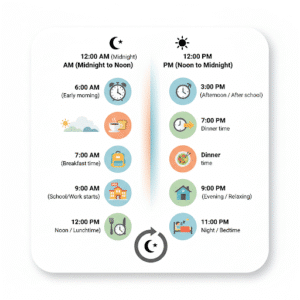 Sometimes, especially in official contexts, you’ll see the 24-hour clock (also known as military time). This avoids the need for AM/PM because each hour has a unique number from 00 to 23.